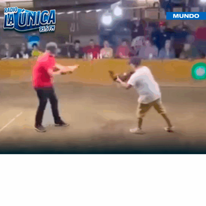 En las imágenes se observa que el propietario pone al ruedo al gallo y este va directo hacía al varón, incrustándole una de las nav4jas en una pierna, causándole una herida de consideración que por poco le cuesta la vida.