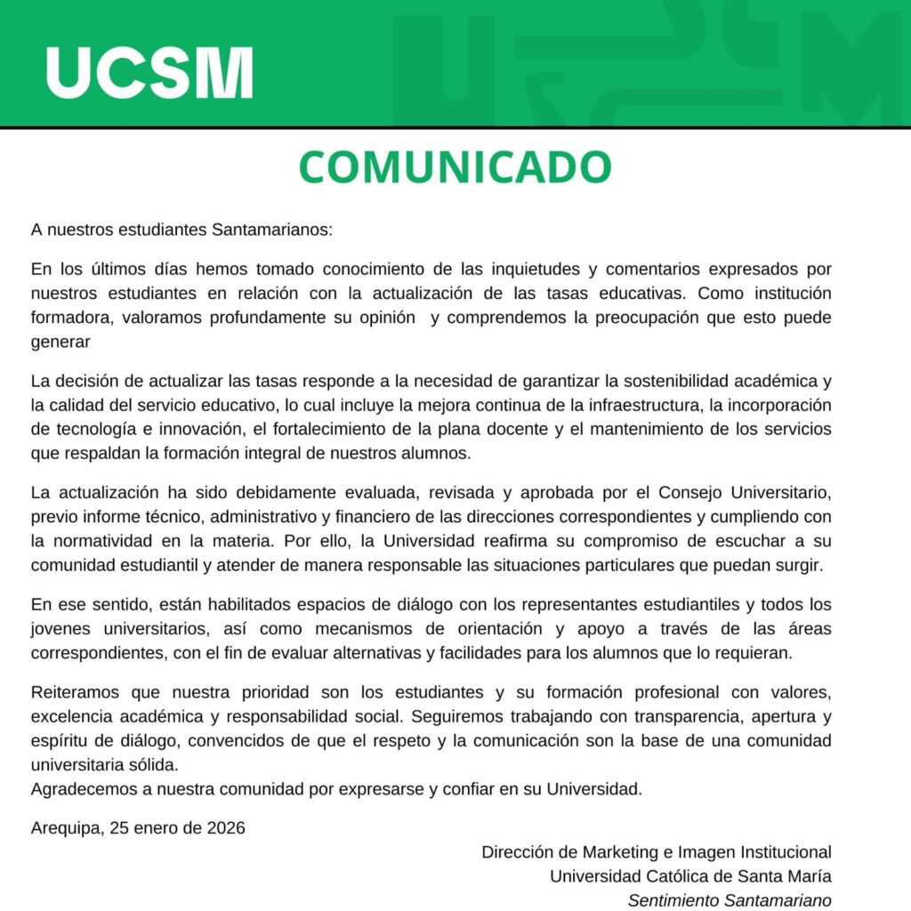 En respuesta, la UCSM emitió un comunicado oficial. La institución aseguró que la actualización de tasas responde a un análisis técnico y financiero. Según el texto, los fondos se destinarán a infraestructura, innovación tecnológica, fortalecimiento docente y mantenimiento de servicios.