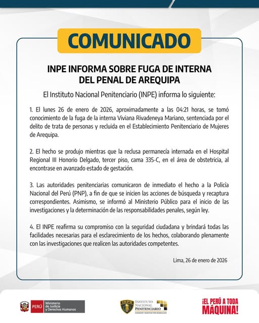 Según el comunicado oficial, la fuga fue detectada el lunes 26 de enero de 2026, aproximadamente a las 04:21 de la madrugada. La reclusa se encontraba internada en el Hospital Regional III Honorio Delgado, en el área de obstetricia. Tras advertir la fuga de la reclusa, el INPE informó de inmediato a la Policía Nacional del Perú. La comunicación permitió activar las acciones de búsqueda y recaptura.