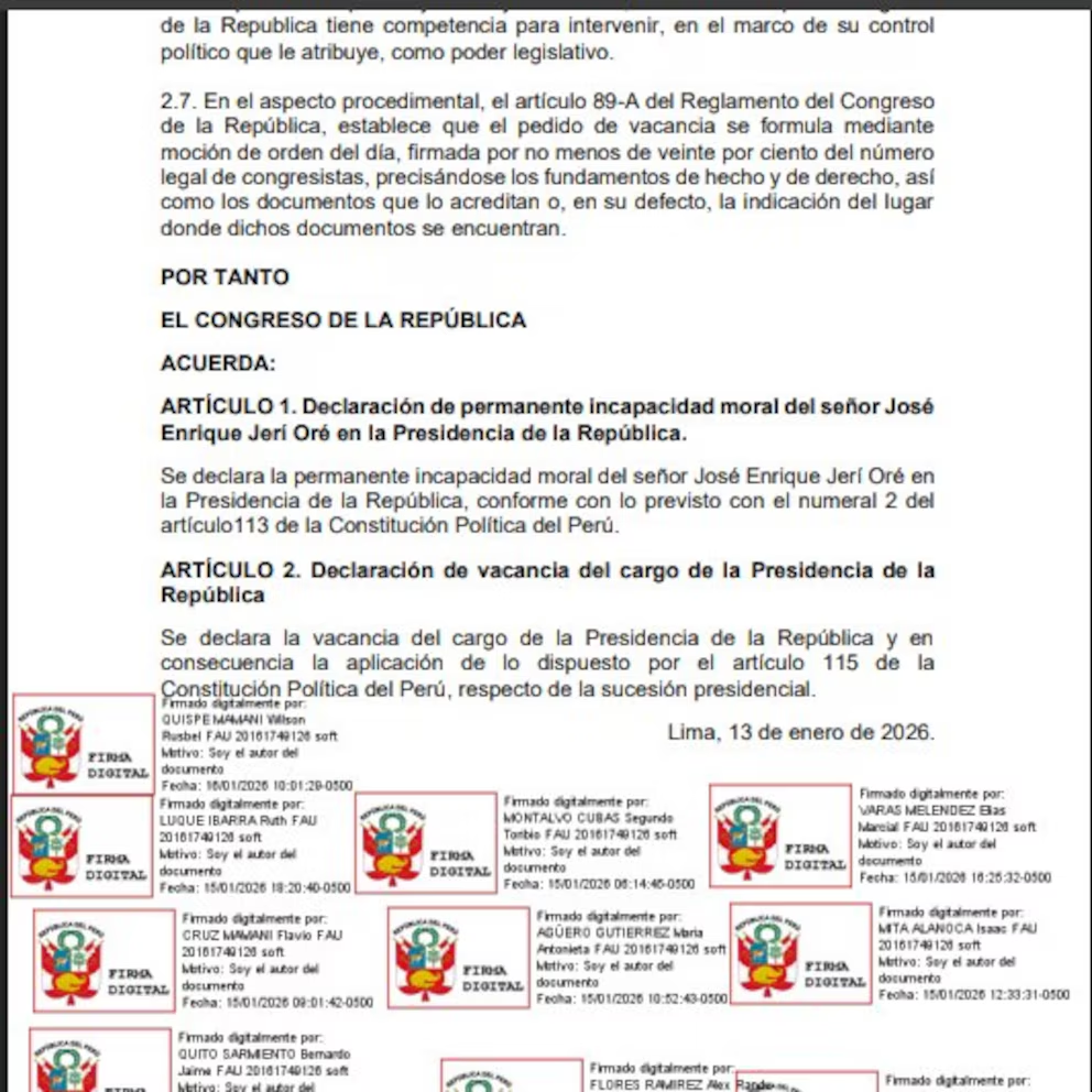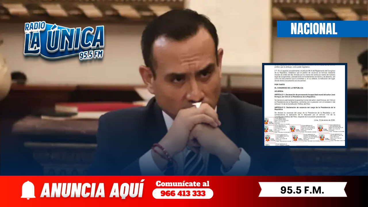El Congreso de la República recibió este 26 de enero una moción de vacancia presidencial contra José Jerí por “incapacidad moral”. El documento, impulsado por el congresista Segundo Montalvo de Perú Libre, reunió las 26 firmas necesarias para iniciar el trámite parlamentario.