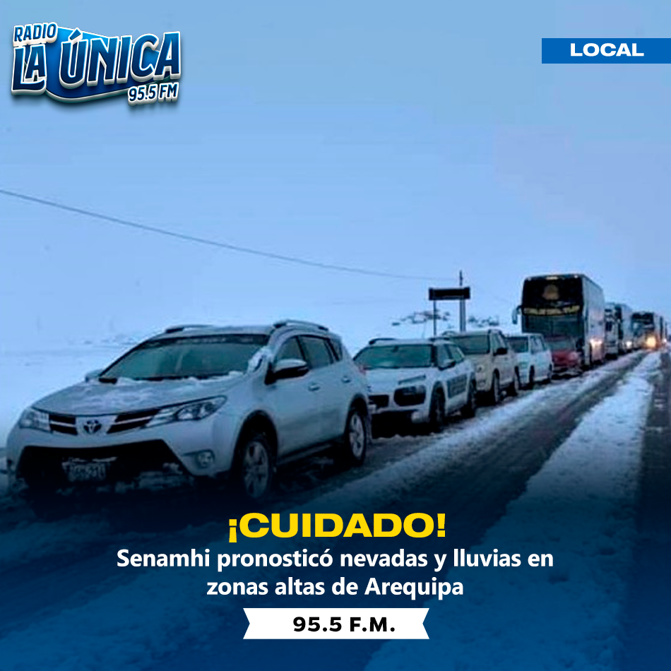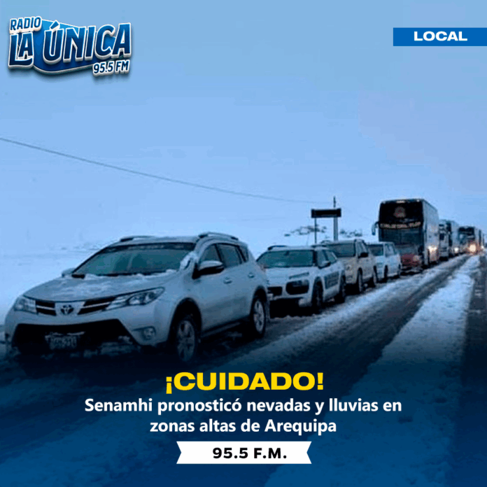 El Servicio Nacional de Meteorología e Hidrología (Senamhi) dio a conocer que hoy se registrarán lluvias de moderada a fuerte intensidad, acompañadas de nevadas, en las zonas altoandinas de Arequipa. La institución informó que las precipitaciones causarían dificultades en el tránsito vehicular en las vías que conectan hacia Cusco y Puno, por lo que se pide a la población y conductores tomar las precauciones del caso.